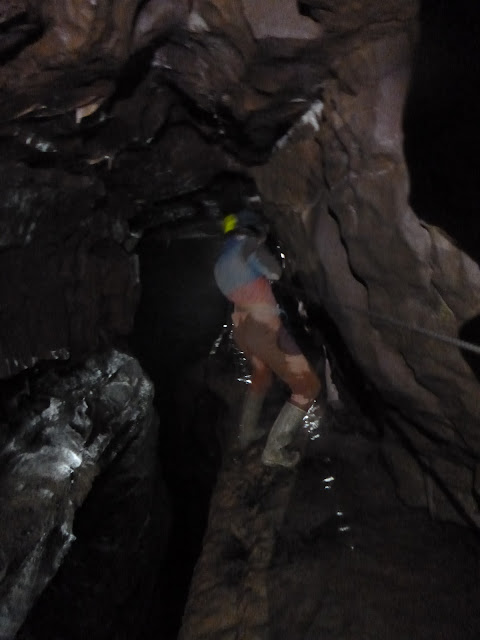 Main Stream Passage's mix of splashing and boulder hopping provided some entertainment, and after a couple of false starts with photography of what is almost certainly just carbide (doh!), we reached the Second Boulder Choke. If you manage to spot them, there are even a few proto-shark fossil spines here, similar to those in Draenen. A short choke then a distinctive climb down into a side passage, followed by another climb down and return to the Main Stream passage, reached the grovel in the stream below the longer part of the choke. A climb up boulders then reached Keyhole Passage, my personal favourite (so why is there no photo?!), a perfect phreatic tube with a deep vadose trench meandering in the floor. We took the upper route, crossing the deep rift repeatedly on the ledges, and then dropping down the climbs to the stream at the far end.